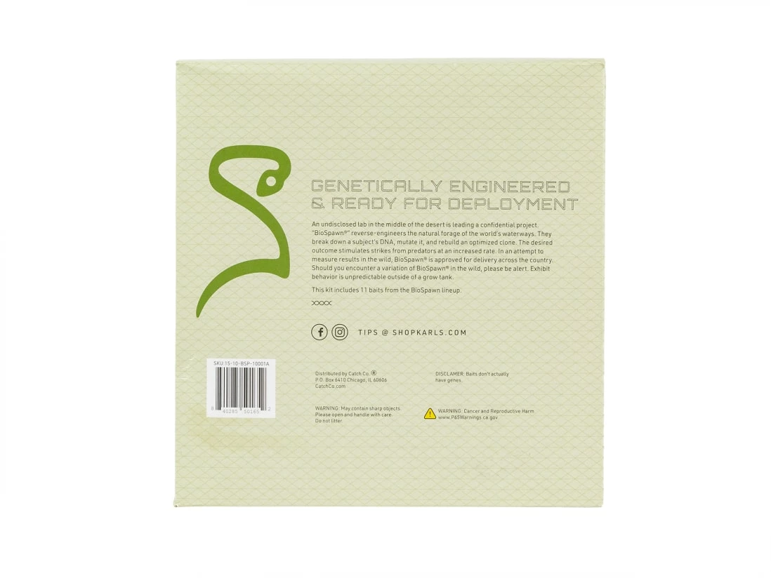 An undisclosed lab in the middle of the desert is leading a confidential project. “BioSpawn” reverse-engineers the natural forage of the world’s waterways. They break down a subject’s DNA, mutate it, and rebuild an optimized clone. The desired outcome stimulates strikes from predators at an increased rate. In an attempt to measure results in the wild, this BioSpawn Essentials Kit is approved for delivery across the country. Should you encounter a variation of BioSpawn in the wild, please be alert. Exhibit behavior is unpredictable outside of a grow tank.