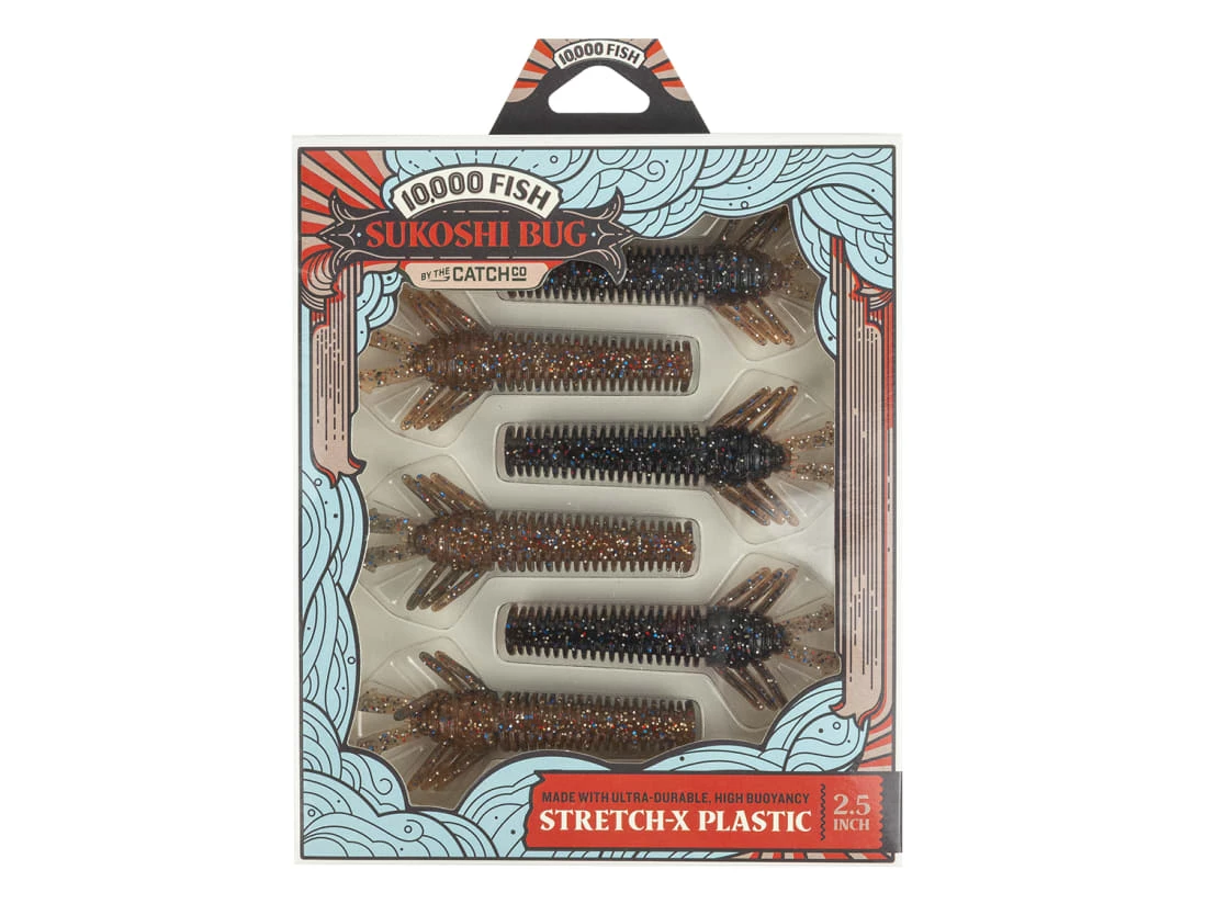 The Sukoshi Bug from 10,000 Fish is a brand new, minimalist, finesse creature bait. The design features a ribbed body made from Stretch-X Plastic, topped of with 6 flapping appendages near the head. The downsized body and tantalizing appendages will make it your new favorite ned rig bait. Stretch-X plastic is just as buoyant as it is durable, and will stand your Sukoshi Bug straight up in the column just begging to be bit. While designed to be ned rigged, it will also generate strikes on a micro-Carolina rig, or as a trailed on your finesse jigs. Whether you drag it over bottom structure or across beds on a Mojo rig, or finesse it on a ned-head, youβll want the Sukoshi Bug in your arsenal ASAP.