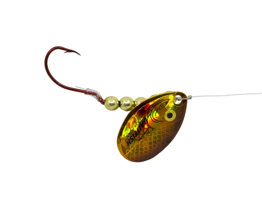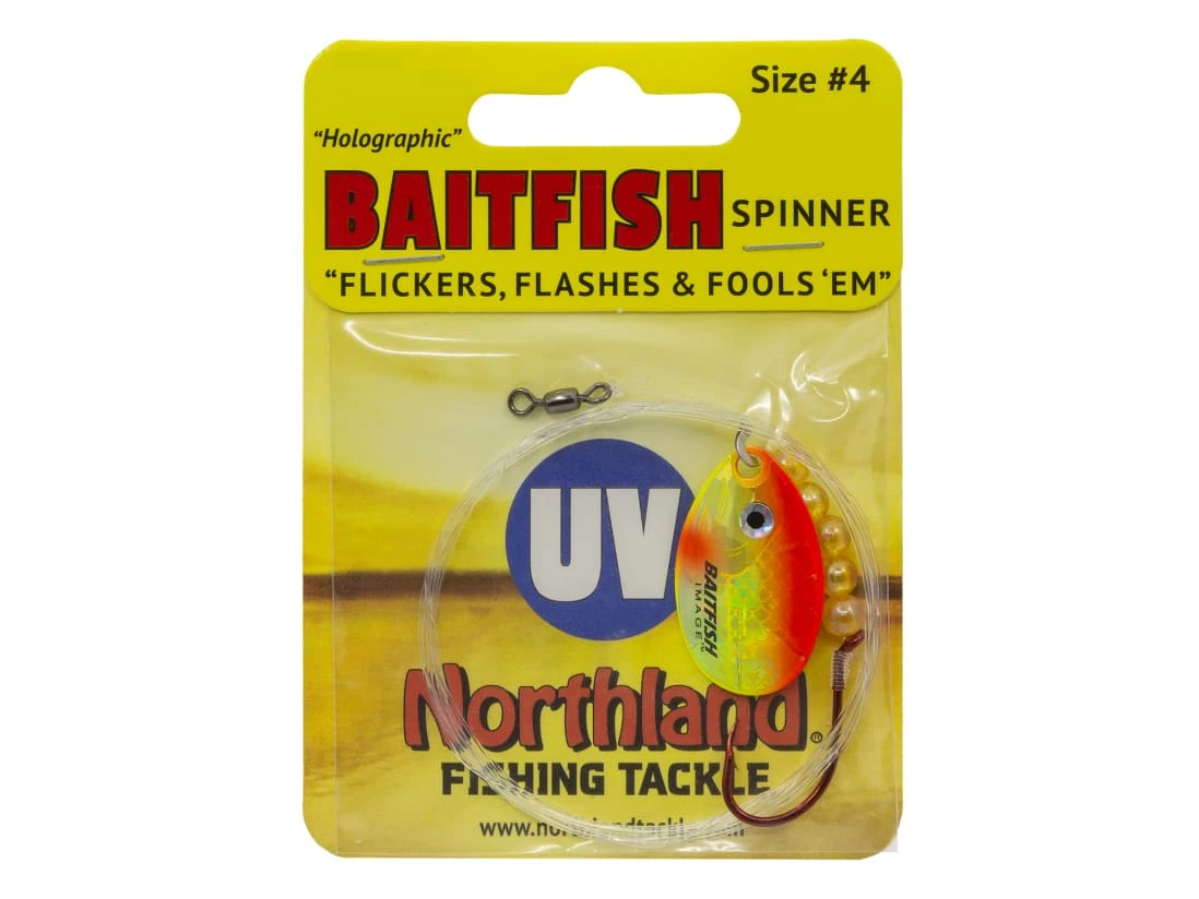 The Northland Tackle Baitfish Spinner rig lets you present live bait with fish-attracting flash and vibration. Nose hook a minnow, leech, or nightcrawler, and this rig does the rest. Its broad blade creates a natural thumping that calls nearby fish, with the baitfish image on the blade creating a lifelike appearance. Cast near cover or slow troll it through the strike zone. Your bait will run straight, with no line twists. Add this premium Baitfish Spinner Rig to your tackle box!