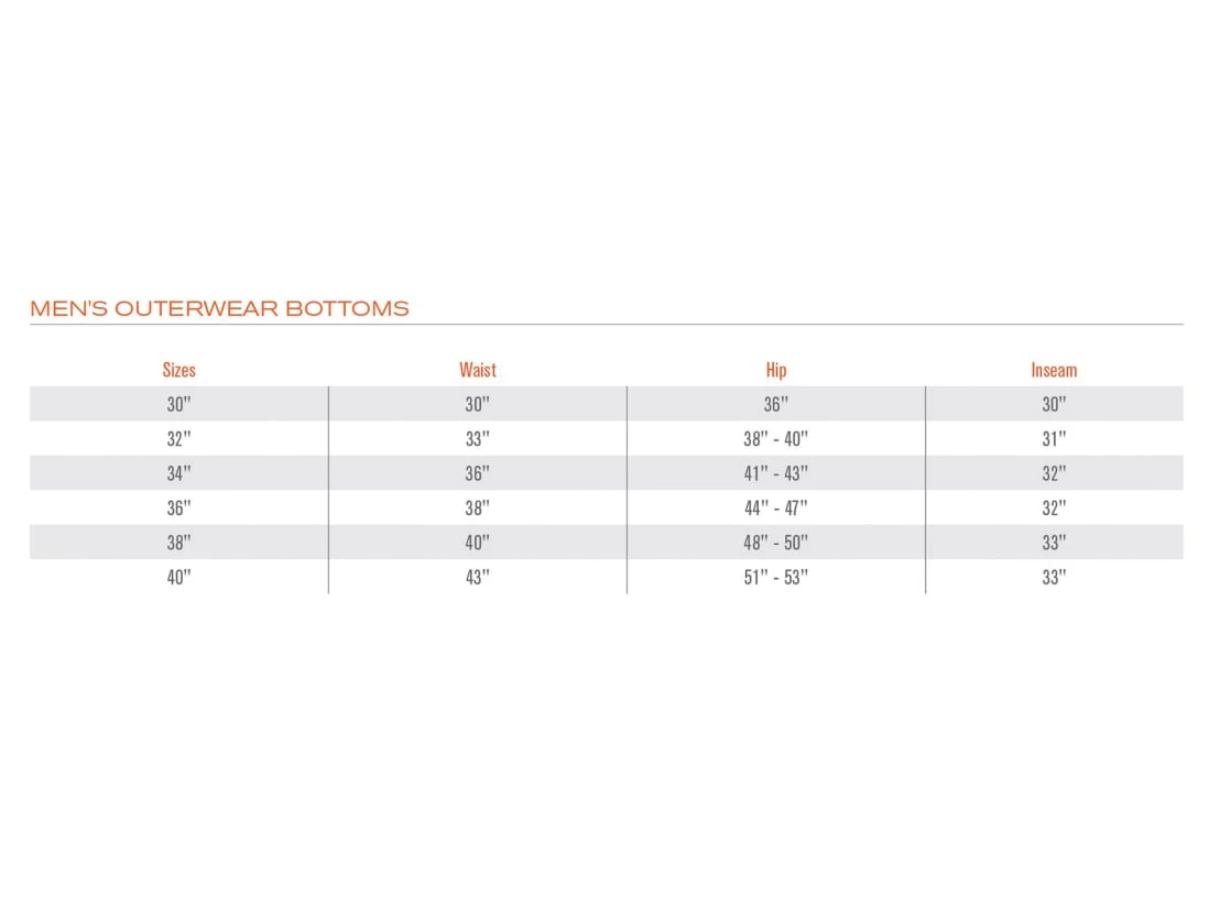 • Chest zipper with waterproof flap; legs zip to the thigh for easy use with boots